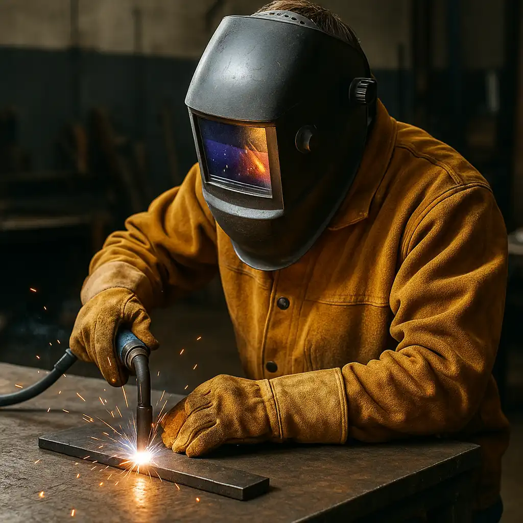 A welder using protective gear in a workshop, with leather gloves, welding jacket, and safety helmet visible while working on metal.